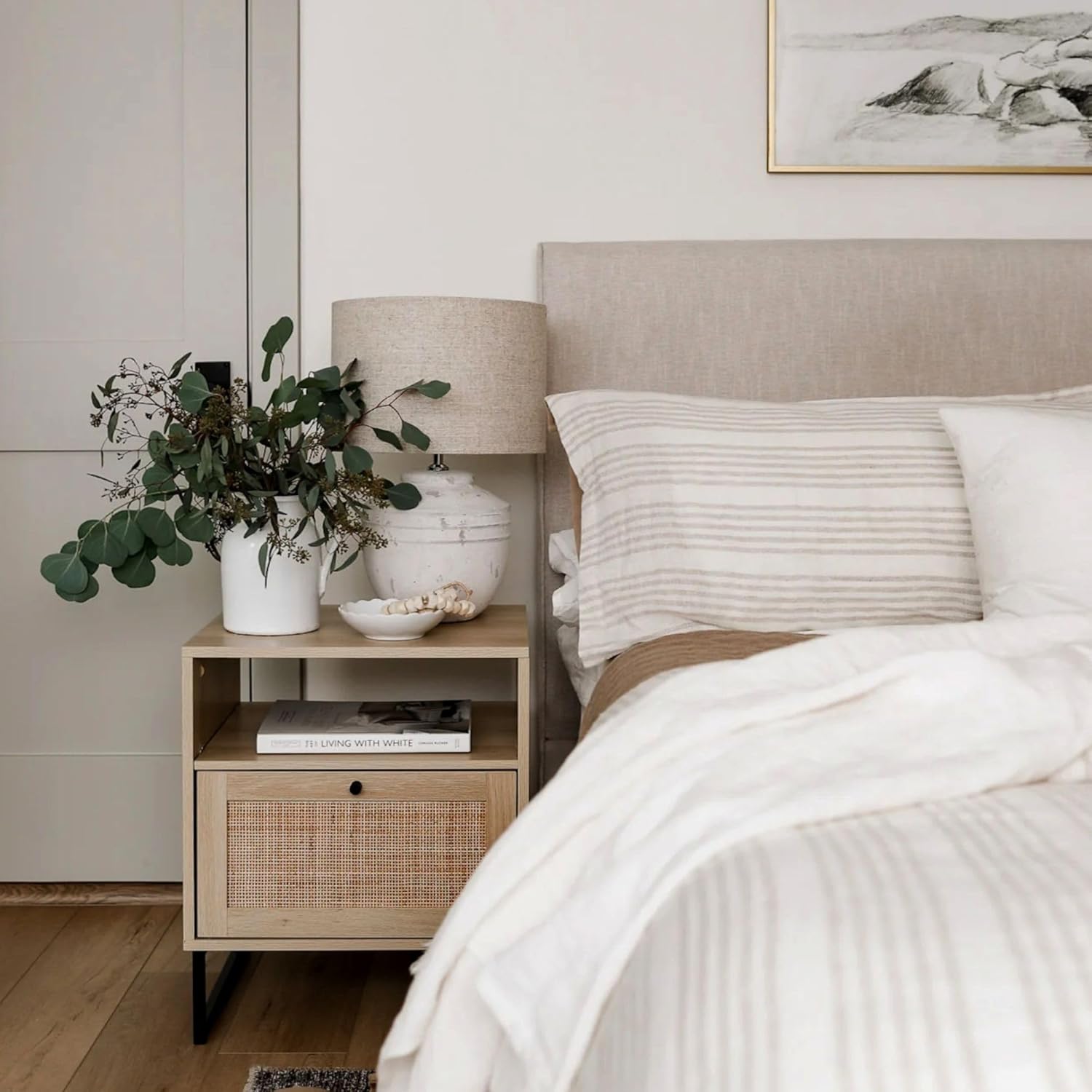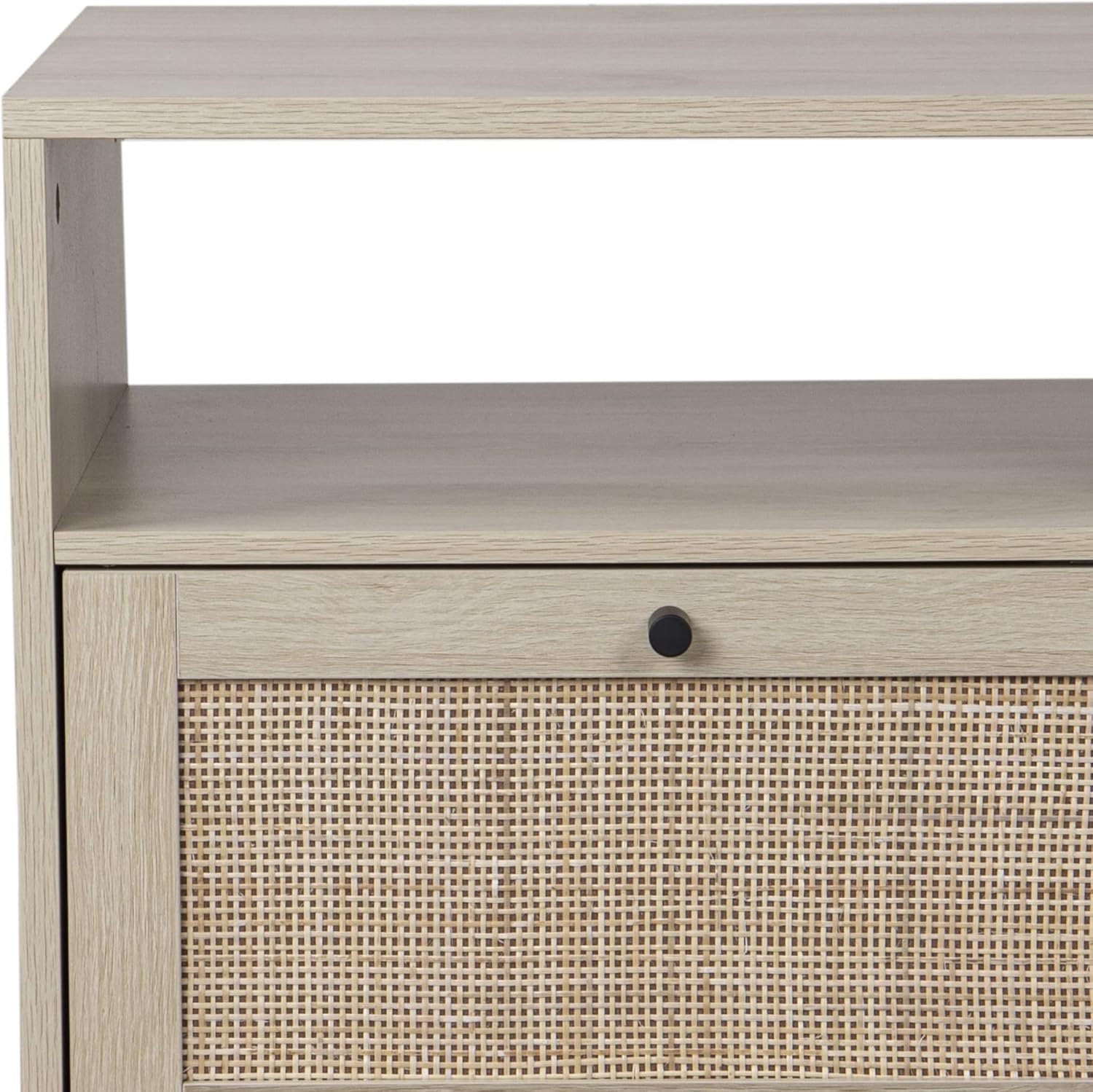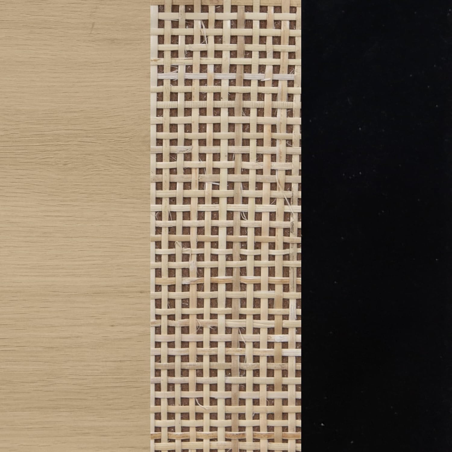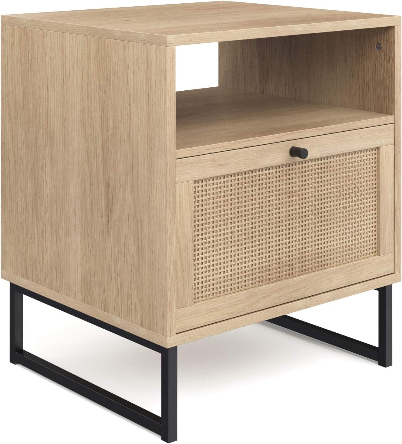 The rattan details on the front door give this end table a unique coastal vibe. Light oak finish top matches matte black metal accents and legs.