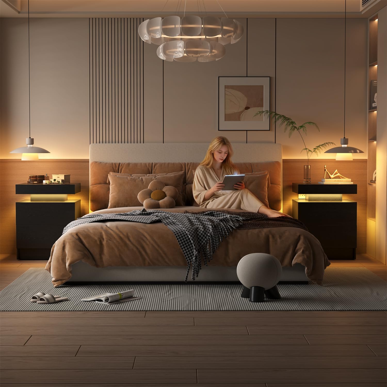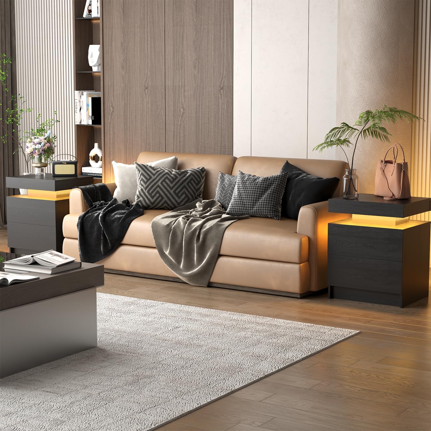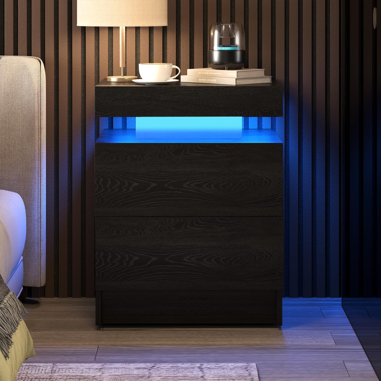 A balanced blend of wood texture and modern LED design.
