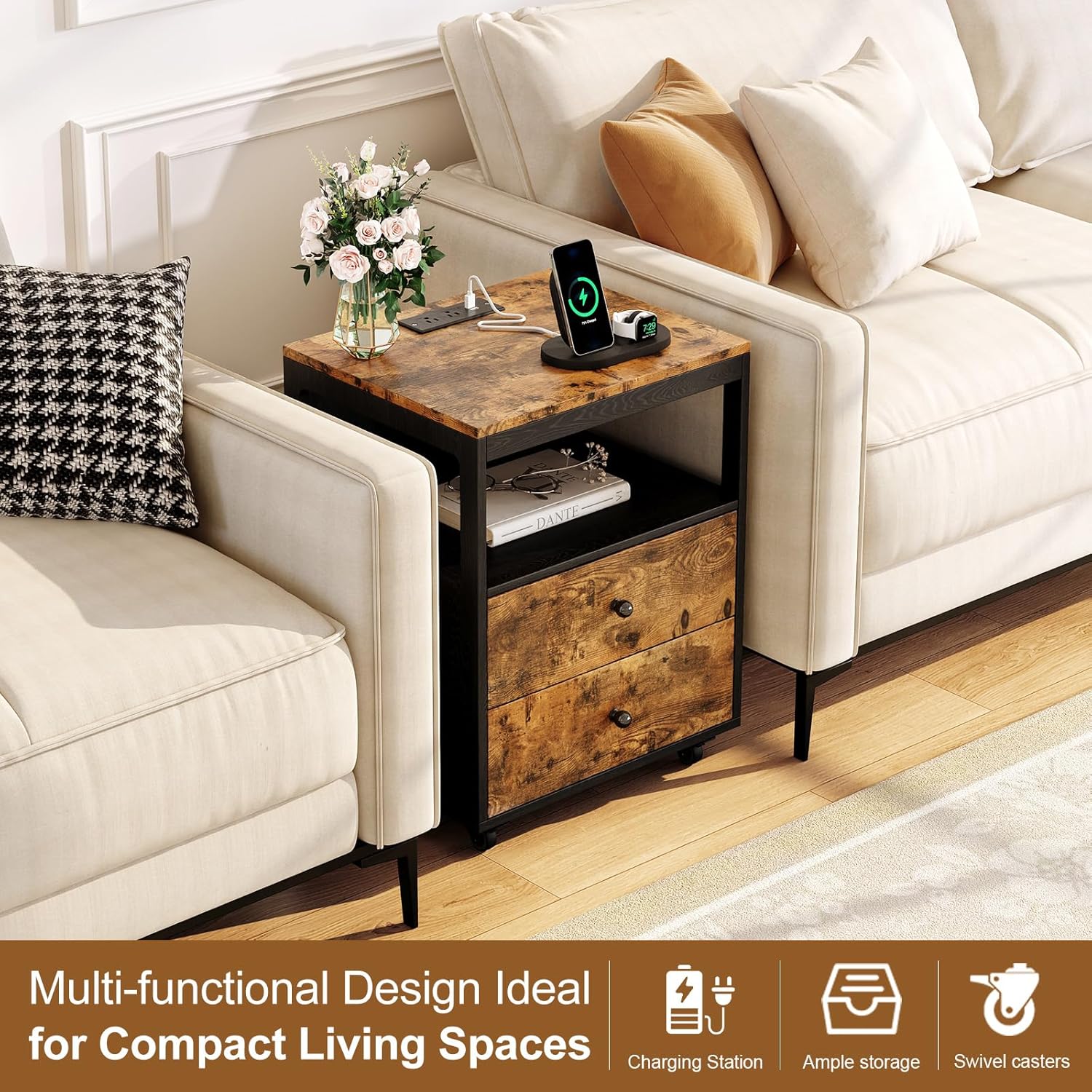 Equipped with four rotatable wheels,two of them have braking capabilities.Moving the side table is incredibly easy and effortless, allowing you to push it to any desired location with minimal effort.